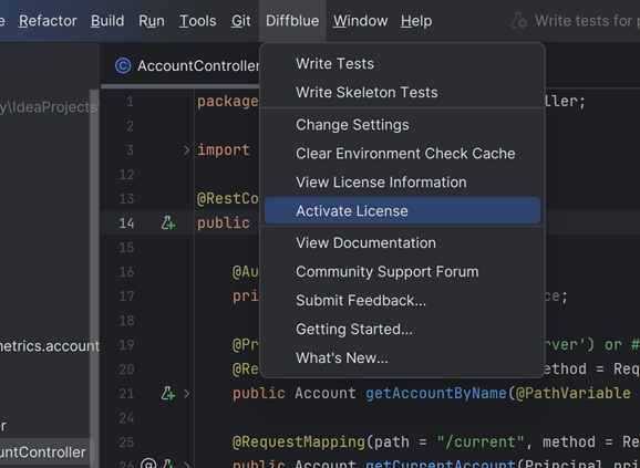 Get started with Diffblue Cover Plugin for IntelliJ - in short, install the plugin, apply your license, and you're ready to go. This topic also provides an example and some next steps.