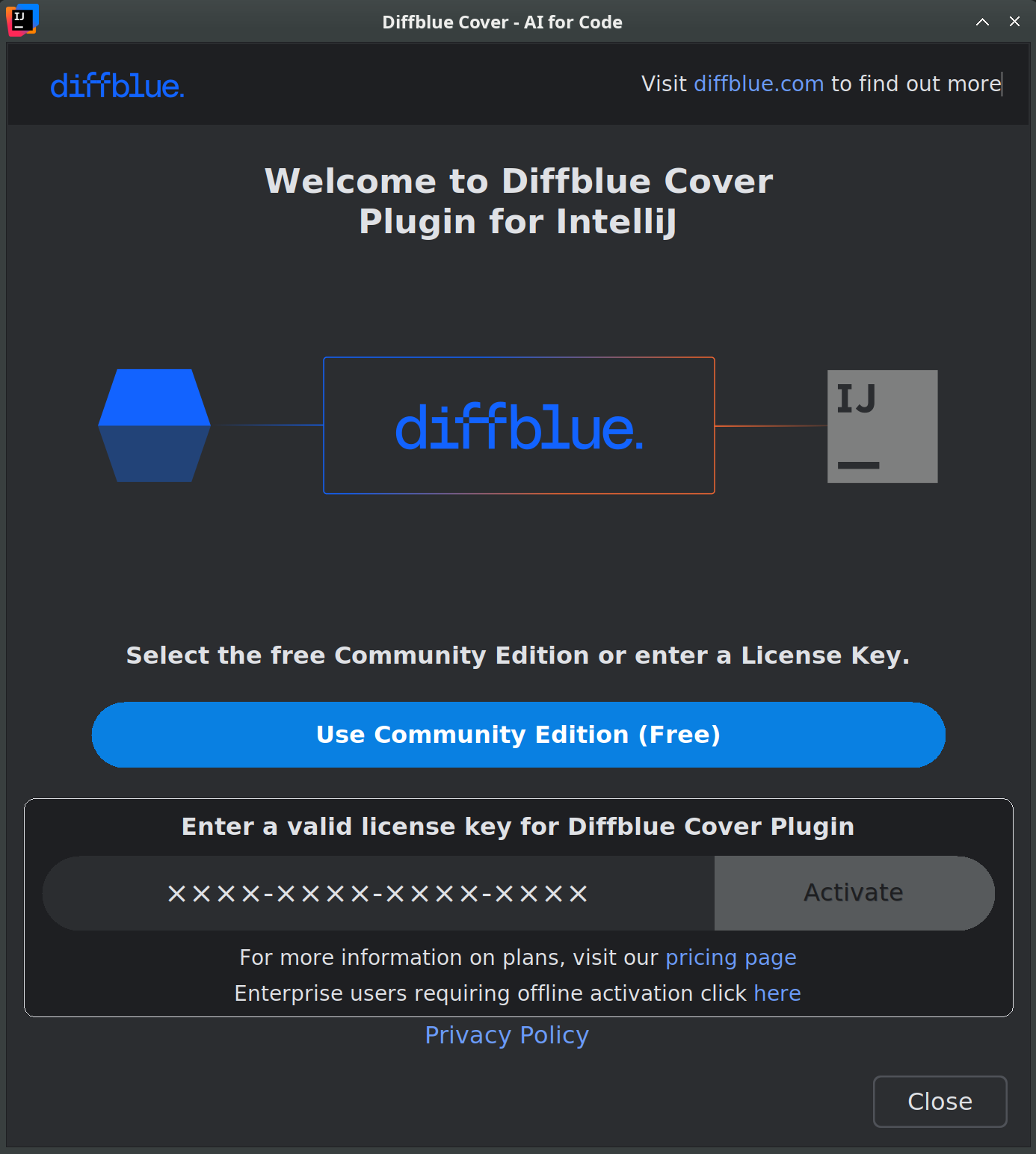 Once IntelliJ has restarted, you'll be prompted for your license key (provided in your welcome email or by your organization) to activate the plugin. Alternatively, the license can be activated at any time from the IntelliJ toolbar `Diffblue > Activate License`. Diffblue Cover requires a remote license check with the Diffblue licensing server each time it's used. For help troubleshooting license keys, network connections, and proxy server settings, see [licensing](https://cover-docs.diffblue.com/get-started/licensing "mention"). Note that: